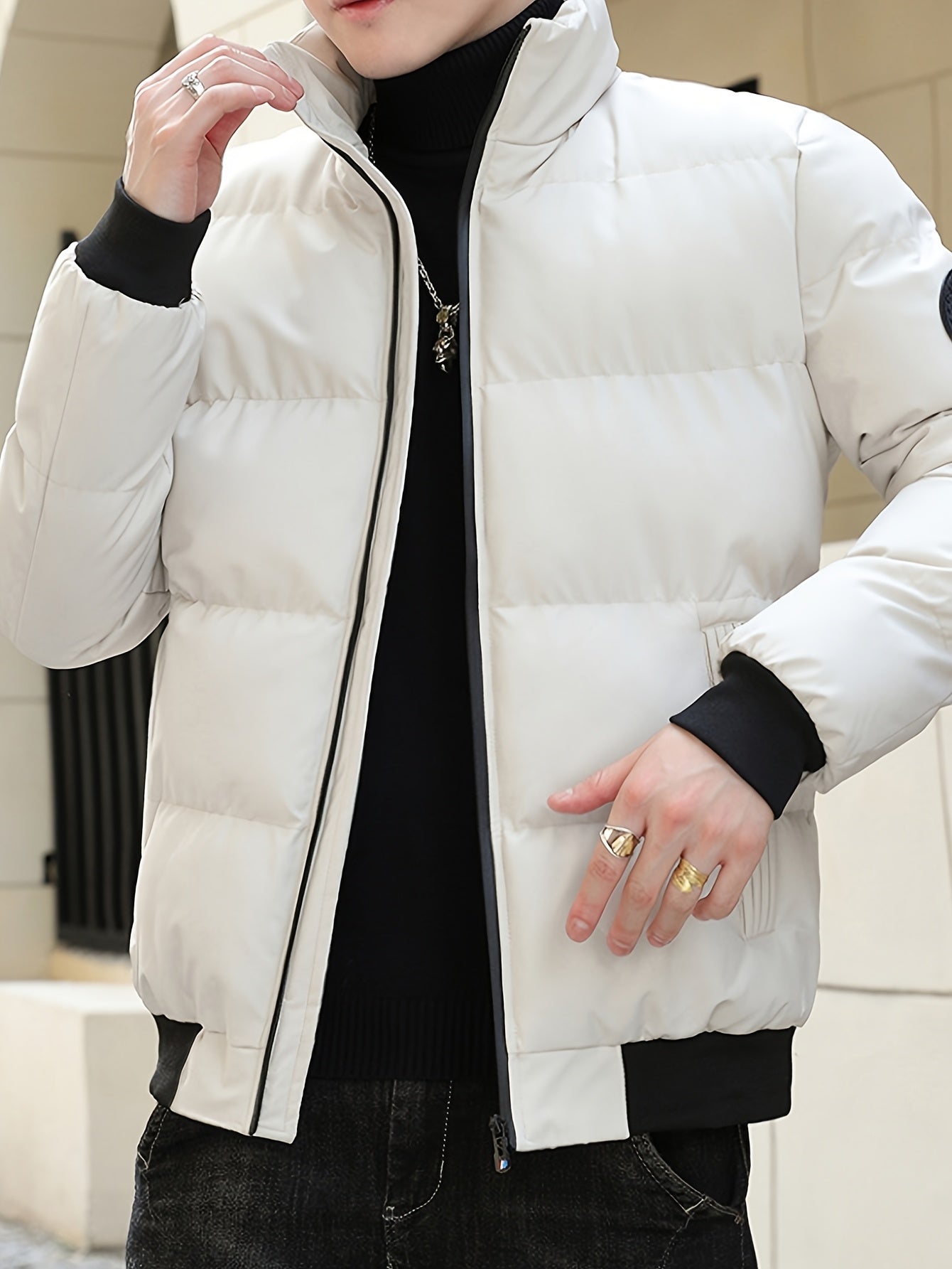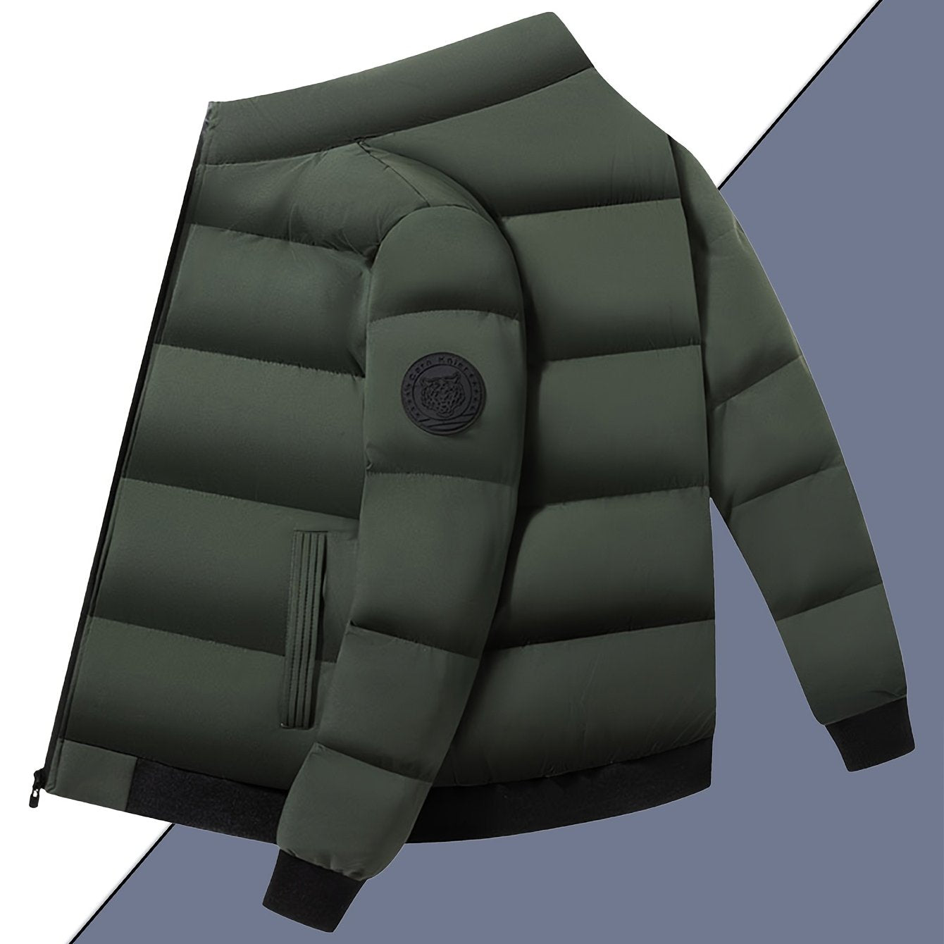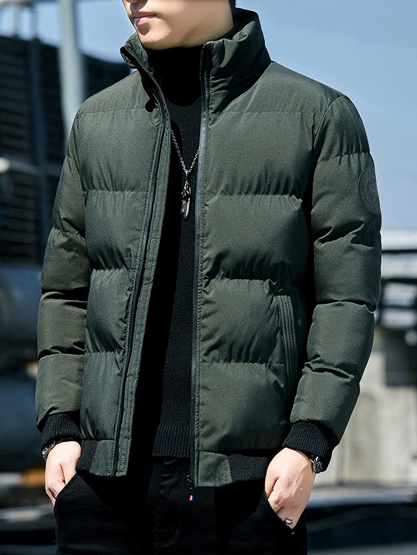 Męska zimowa kurtka pikowana ze stójką i gładką powierzchnią. Krótki, dopasowany krój tworzy uporządkowany wygląd, odpowiedni na co dzień. Kieszenie na zamek i zapięcie z przodu dodają praktyczności w użytkowaniu.