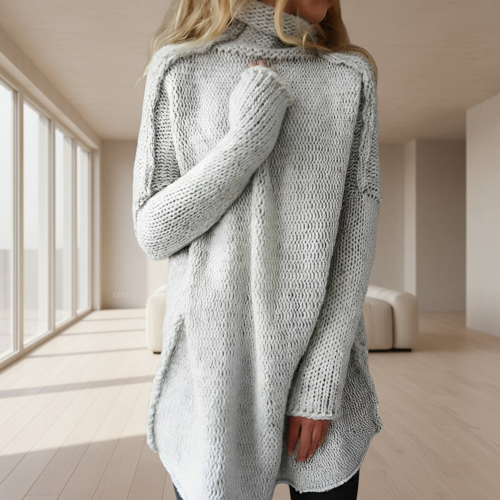 Damski zimowy sweter o dłuższym kroju z wysokim kołnierzem łączy prostotę z nowoczesnym fasonem. Doskonały do codziennych stylizacji, zapewnia swobodę noszenia i schludny wygląd.