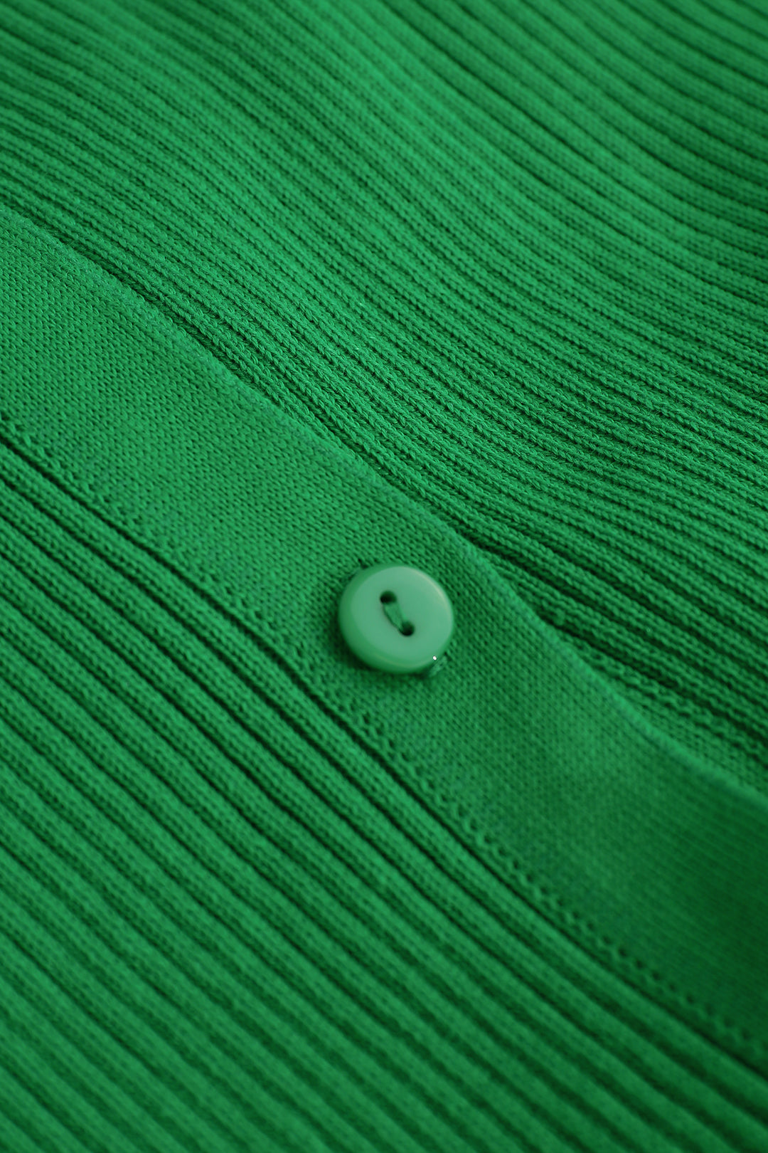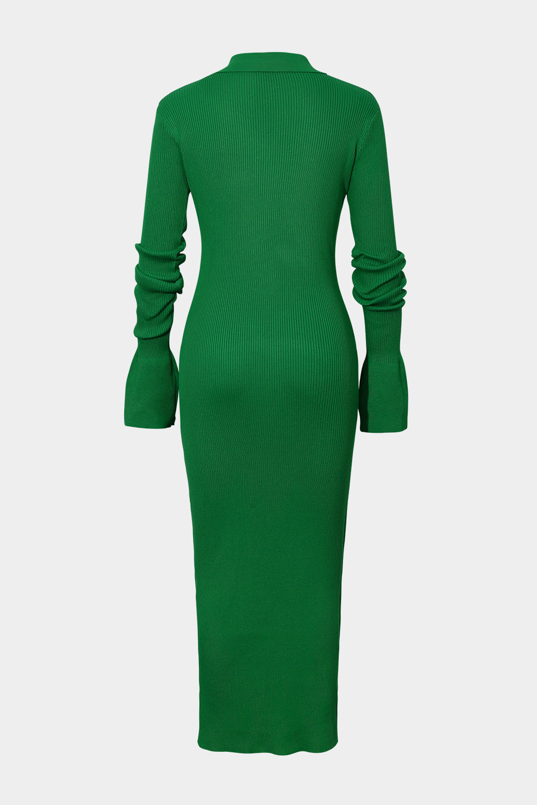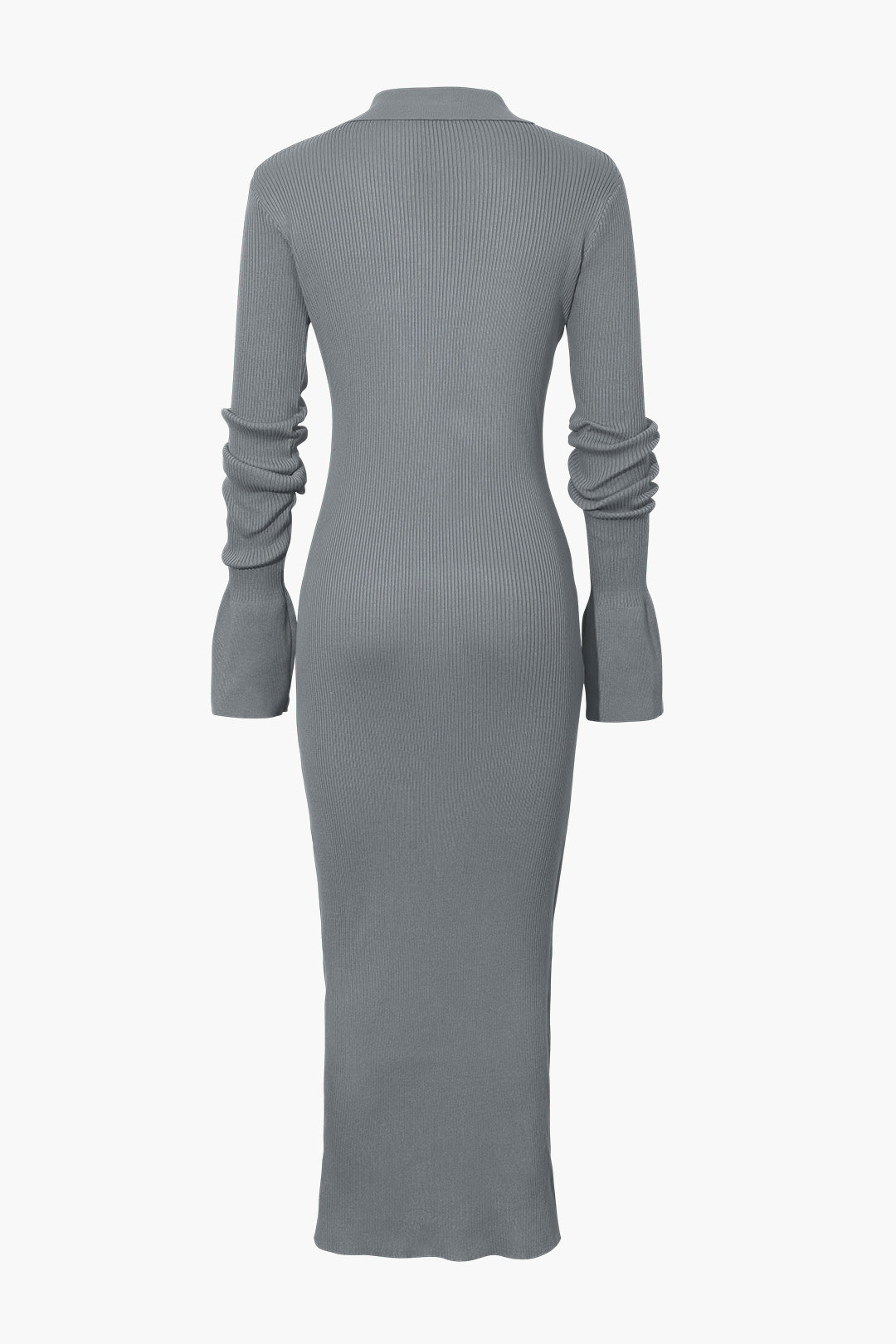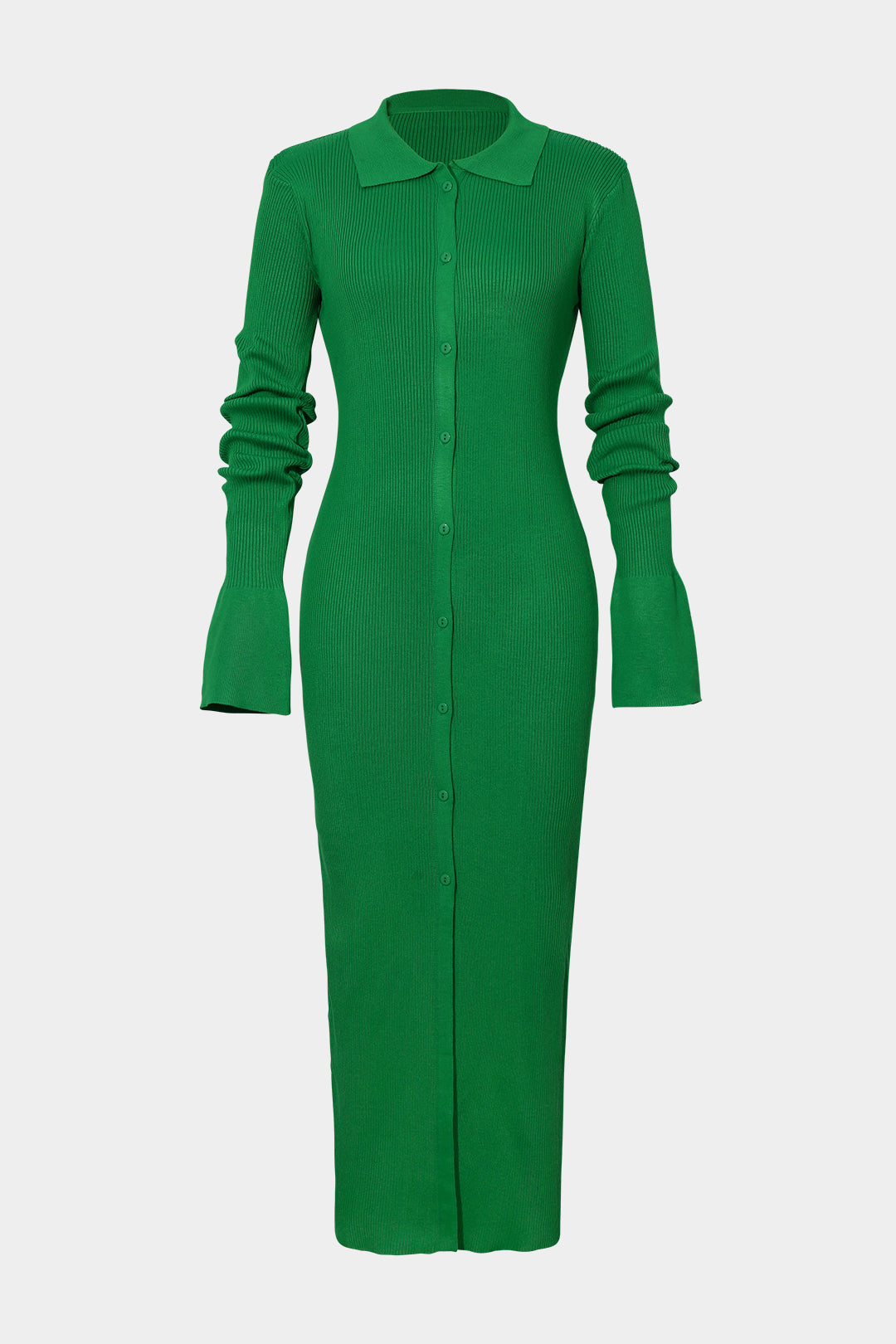 Ta sukienka maxi z guzikami ma strukturalny kołnierz, długie rękawy i prostą sylwetkę. Zapięcie na guziki oferuje wszechstronne możliwości stylizacji, a prążkowana tekstura dodaje definicji wyglądowi. Zaprojektowana w długości maxi, łatwo przechodzi od codziennych do wieczorowych stylizacji.